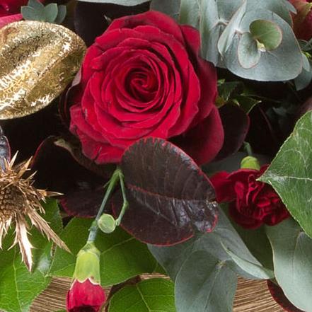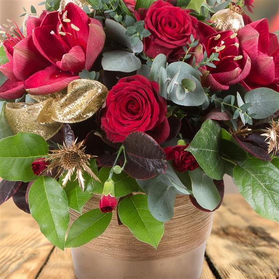 This beautiful arrangement includes amaryllis, long stemmed and spray red roses with a selection of seasonal foliage. Cones and silver clusters give this arrangement a stylish festive feel.